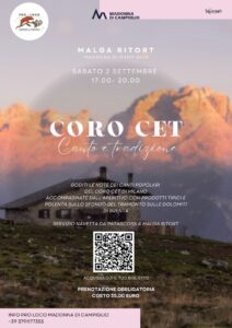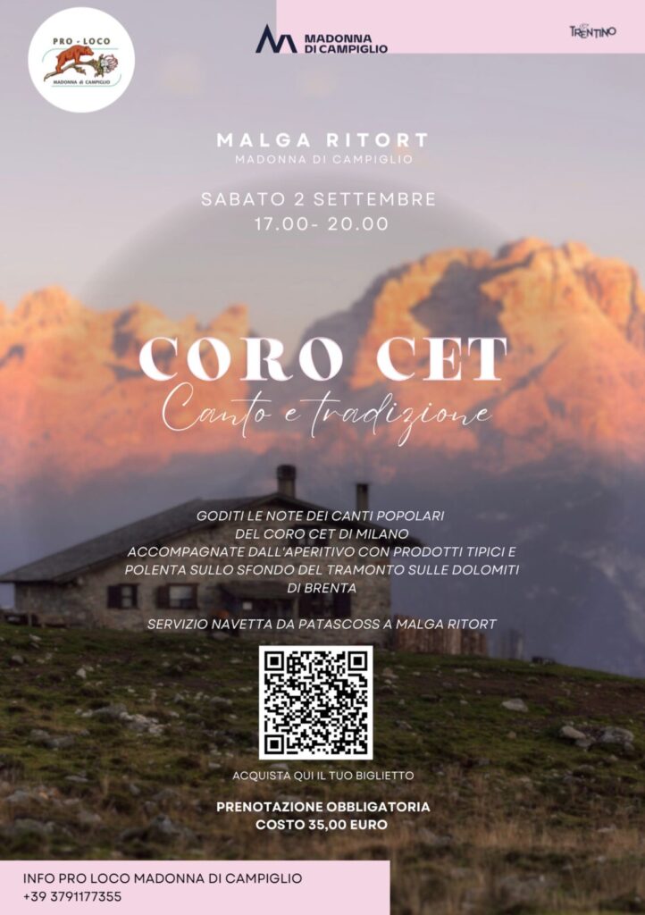 Concerto a Malga Ritort (Madonna di Campiglio). Sabato 2 settembre ci esibiremo nell’ambito di un evento organizzato dalla pro-loco di Madonna di Campiglio presso Malga Ritort a partire dalle 17.00. Prenotazione obbligatoria al link: https://oooh.events/evento/tramonto-con-il-coro-cet-canto-e-tradizione-biglietti/