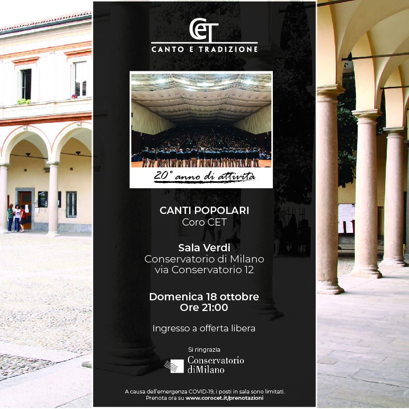 Coro CET di nuovo in concerto dal vivo. In occasione del ventesimo del coro e in collaborazione con il Conservatorio Giuseppe Verdi di Milano vi aspettiamo per una serata all’insegna del canto popolare. Domenica 18 ottobre presso la Sala Verdi del Conservatorio G.Verdi di Milano (Mappa) ore 21. Ingresso a offerta libera.