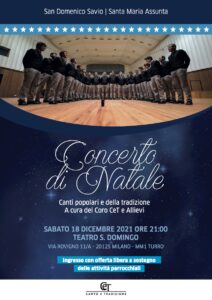 Il coro CET e Allievi sono lieti di invitarvi al concerto di Natale. Sabato 18 Dicembre presso il Teatro S.Domingo in via Rovigno 11/A, Milano MM1 Turro (Mappa) ore 21, ingresso con offerta libera a sostegno delle attività parrocchiali.