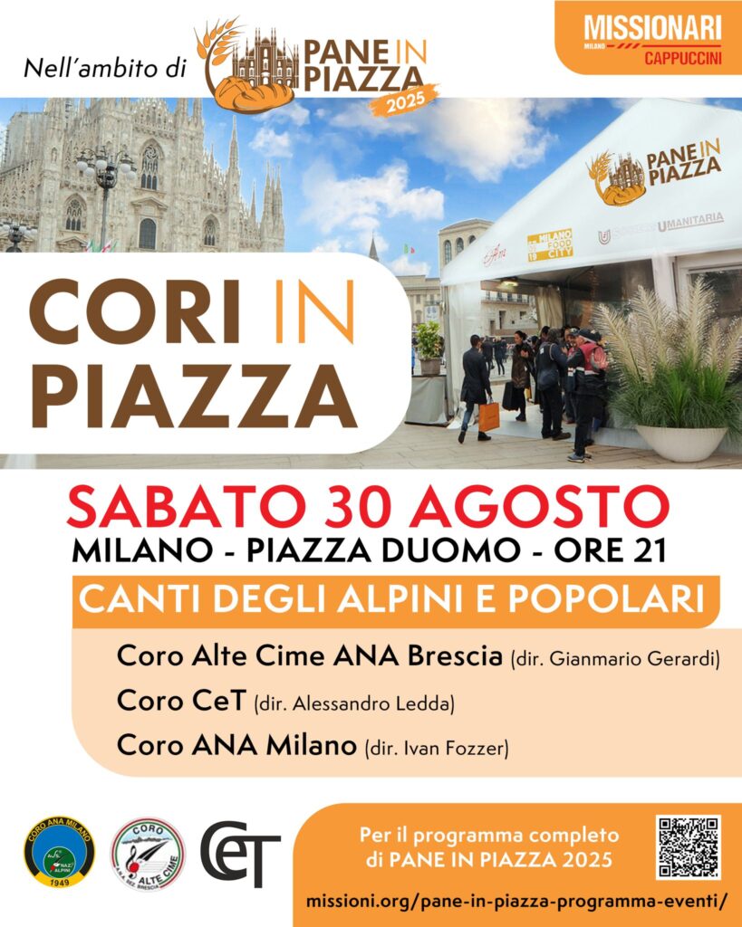 Cori in piazza. Canti degli alpini e popolari nell’ambito di “Pane in Piazza” evento culturale e benefico organizzato dai Frati Cappuccini Missionari. Insieme ai coro ANA Milano e ANA Alte Cime Brescia. Milano, piazza Duomo, ore 21.00.
