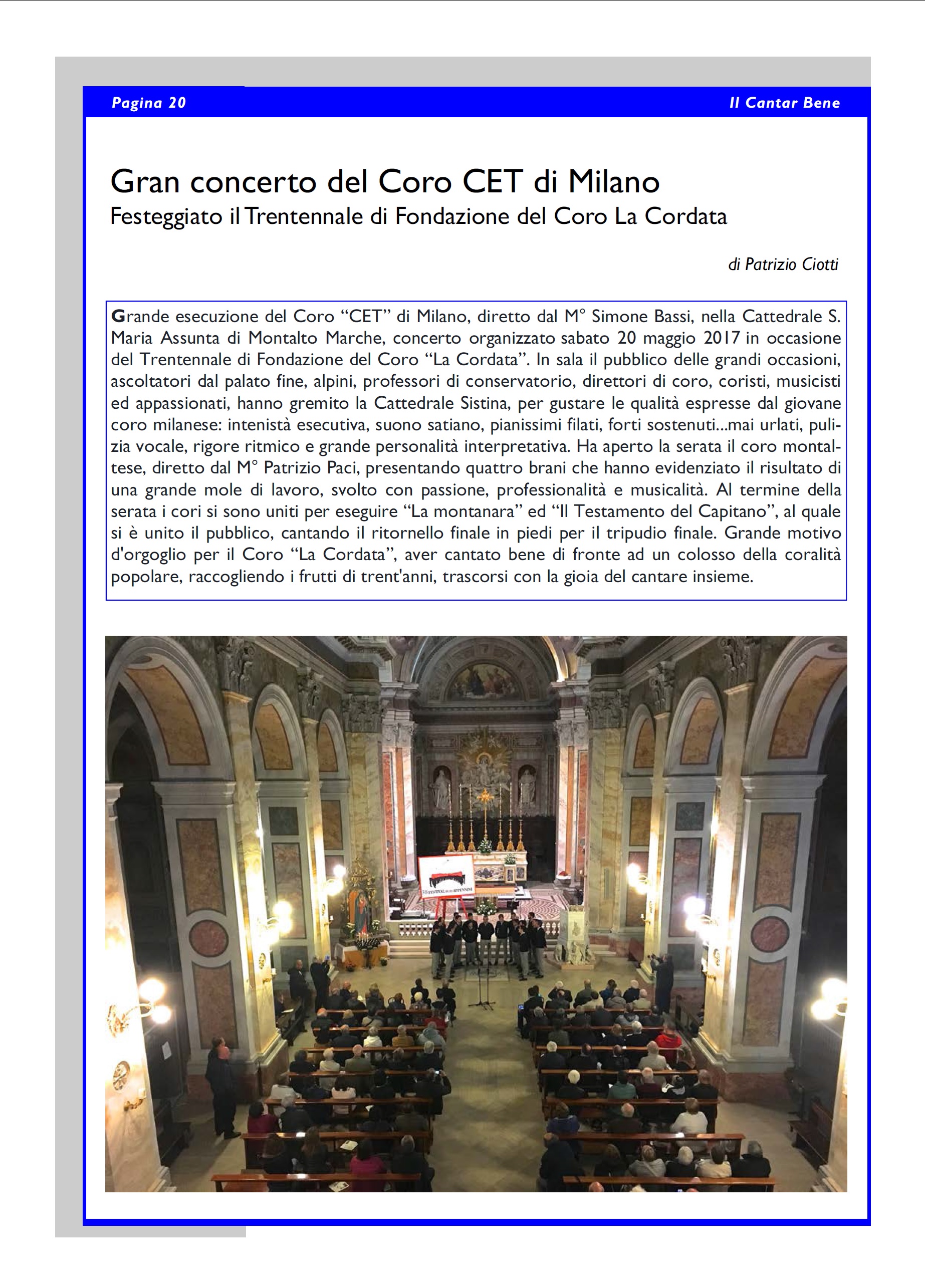 Grande esecuzione del Coro “CET” di Milano, diretto dal M° Simone Bassi, nella Cattedrale S.Maria Assunta di Montalto Marche, concerto organizzato sabato 20 maggio 2017 in occasione del Trentennale di Fondazione del Coro “La Cordata”. In sala il pubblico delle grandi occasioni, ascoltatori dal palato fine, alpini, professori di conservatorio, direttori di coro, coristi, musicisti ed appassionati, hanno gremito la Cattedrale Sistina, per gustare le qualità espresse dal giovane coro milanese: intenistà esecutiva, suono satiano, pianissimi filati, forti sostenuti…mai urlati, pulizia vocale, rigore ritmico e grande personalità interpretativa. Ha aperto la serata il coro montaltese, diretto dal M° Patrizio Paci, presentando quattro brani che hanno evidenziato il risultato di una grande mole di lavoro, svolto con passione, professionalità e musicalità. Al termine della serata i cori si sono uniti per eseguire “La montanara” ed “Il Testamento del Capitano”, al quale si è unito il pubblico, cantando il ritornello finale in piedi per il tripudio finale. Grande motivo d’orgoglio per il Coro “La Cordata”, aver cantato bene di fronte ad un colosso della coralità popolare, raccogliendo i frutti di trent’anni, trascorsi con la gioia del cantare insieme.